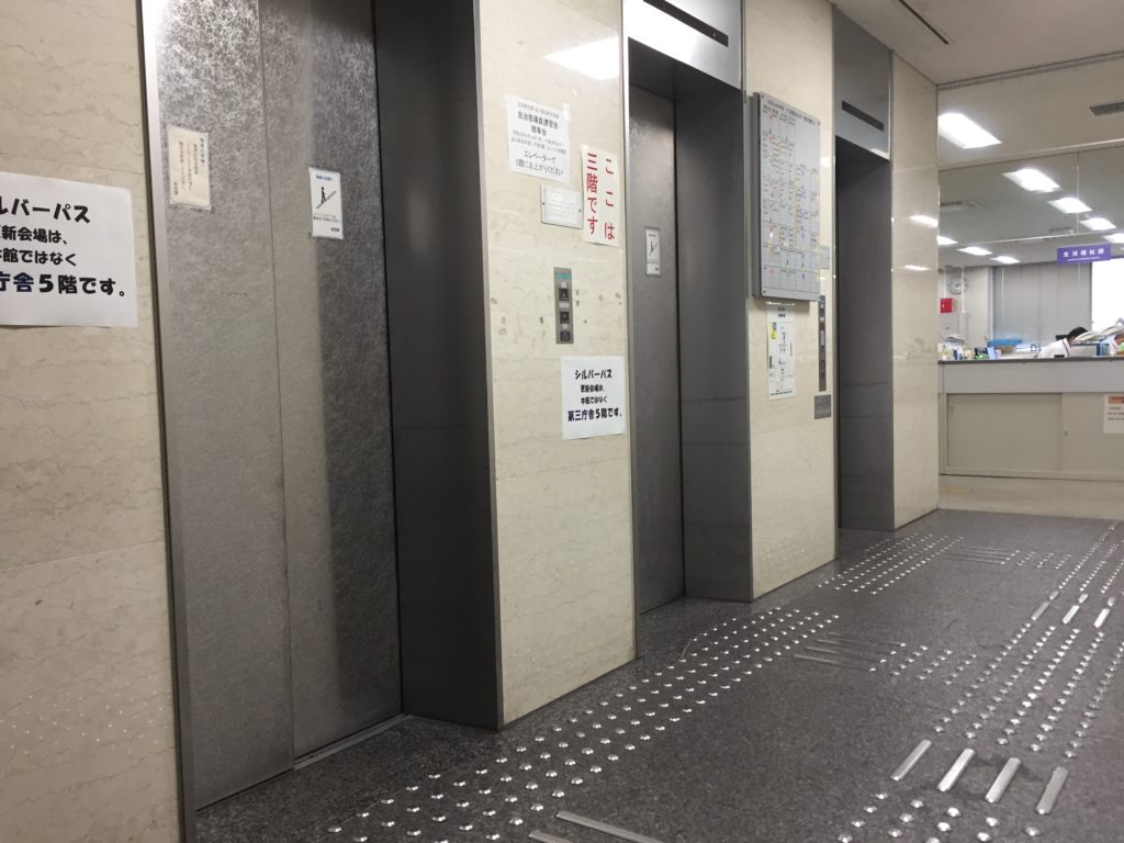 第2庁舎のエレベータ、エレベータは3台あります。一番奥が車椅子用だったと思います。奥だけボタンが低い位置に設置されています。ここのエレベータは車椅だとすごく難点を感じました!まず、点字ブロックが車椅子の前輪に当たって乗越えるのが大変なこと、エレベータ内がかなり狭く車椅子1台入ると中で転回ができず、他の人が乗ってくるとすごく狭い感じがしました。