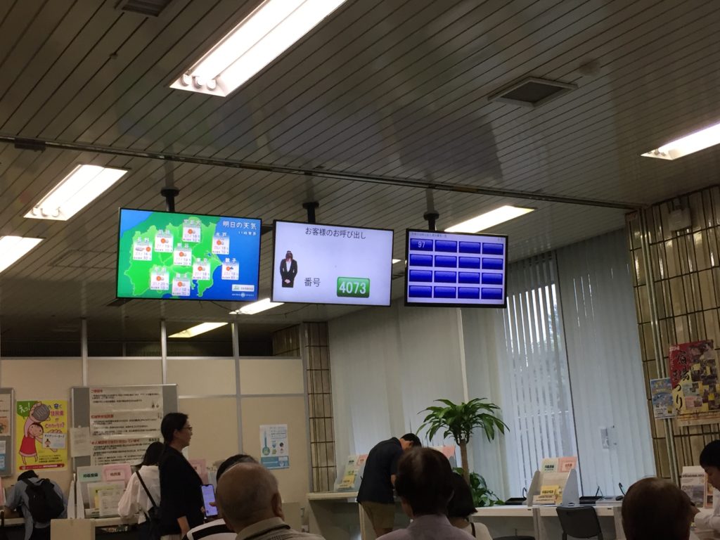 窓口の風景、記載台は、低い台も設置されていて車椅子利用者や高齢者の方への配慮もされている感じです。上の画面を見ると、窓口では番号で呼ばれるみたいですね!(プライバシー保護の関係だと思います)
