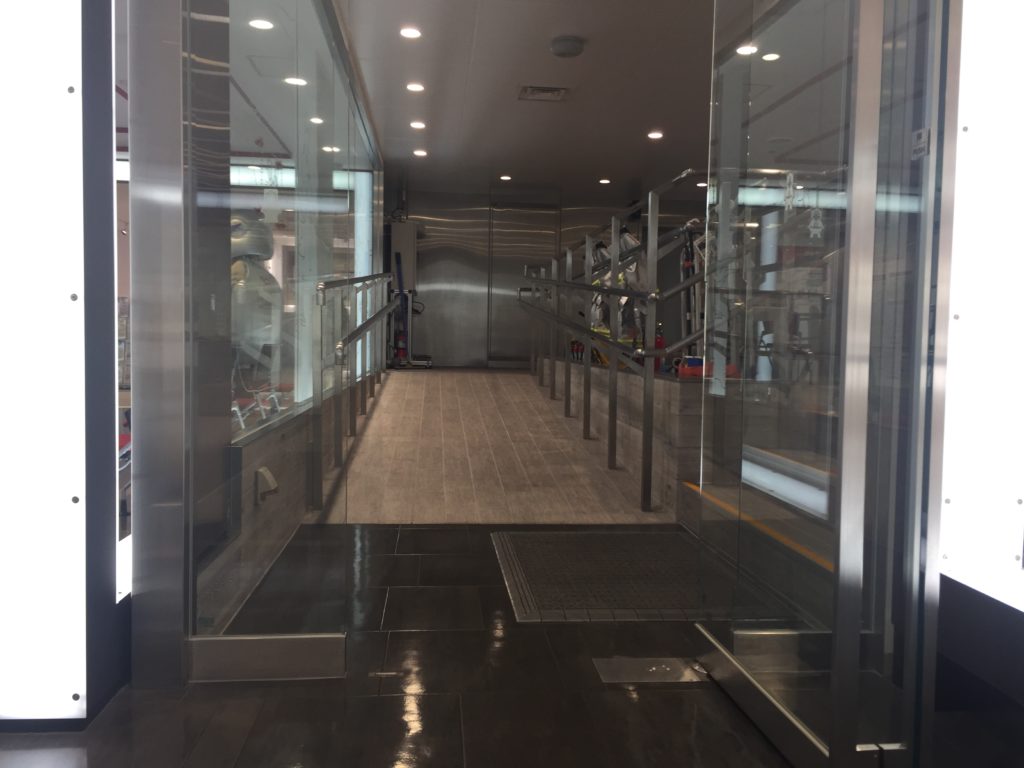 エレベータを出て右側にスロープがあります。車椅子1台十分に通れる幅でしたが、一人で車椅子を漕いで上がるのは、少し傾斜がきつい感じがしました。ドアは大きく自動ドアになっています。反対側は、健常者用の出入口になっていて1~2段の段差がありました。