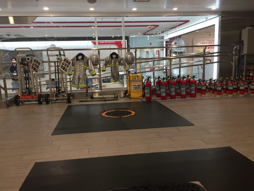 スロープを上がると、消火器や路上にある消火栓などが設置されていて実際に消火体験することができます。子供たちが喜びそうな消防服やヘルメットもあって着ることができます!