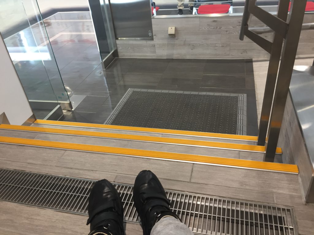 スロープの横には階段もありました。健常者の方は3段上がれば体験スペースに上がれます。