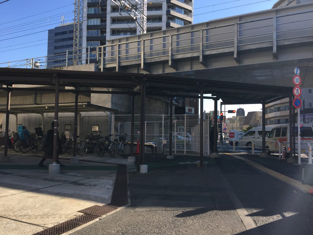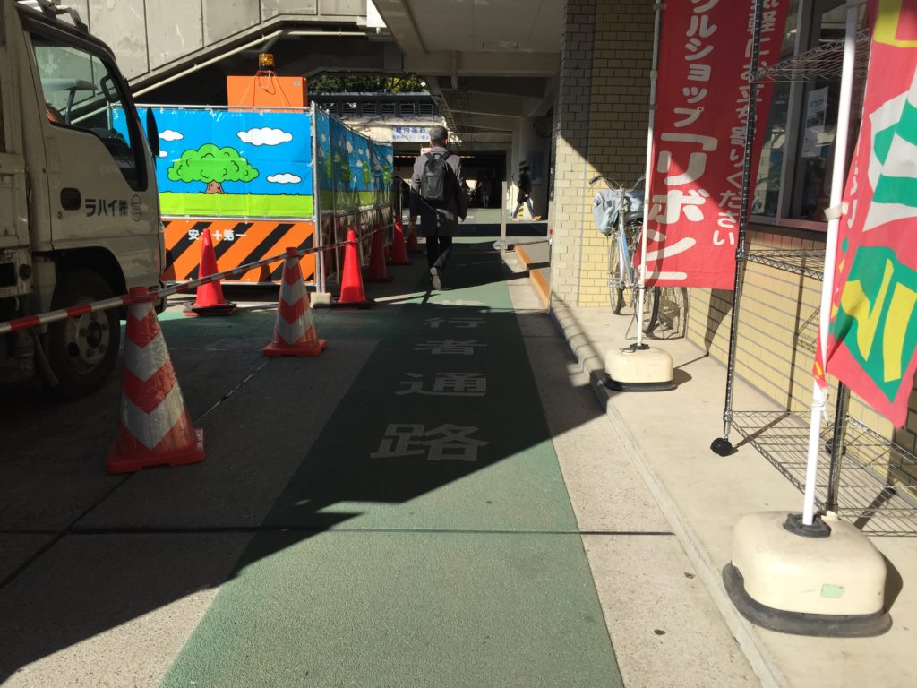 (下の写真)うえを走っているのが東急大井町線です。向かって左側が大井町駅で駅から歩いてくると区役所までずーっと屋根があります。大井町線の高架を過ぎたあたりから、区役所までの順路が分かるように路面に緑色の「歩行者通路」があり迷わずに来ることができると思います。