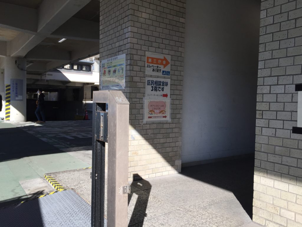 途中、駐車場の手前に第3庁舎のエレベータがあります。マークを見るかぎり車椅子対応のエレベータになっていると思われます。3階には「区民相談室」の窓口があるみたいです!(実際に利用したことがないので、詳しいことが分かりません💦機会があったら見てきますね)