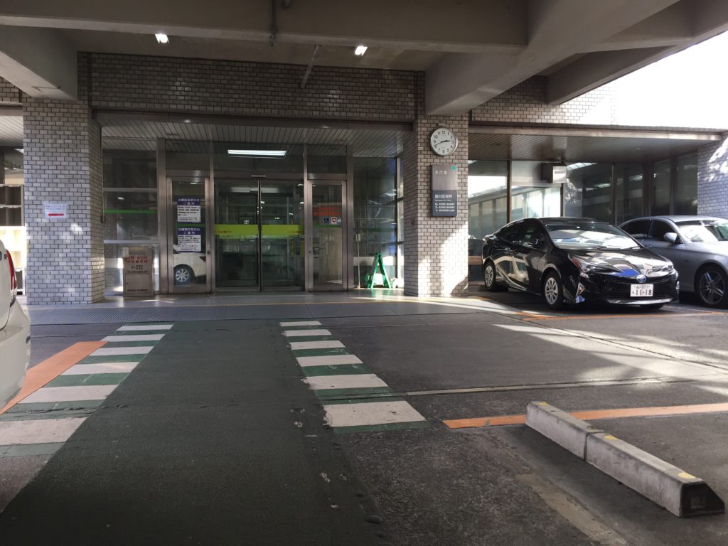 本庁舎2階エントランス:手前は駐車場になっています。駐車は区役所の窓口利用であれば2時間まで無料で利用することができます。入口付近の2台分(写真2枚目のカラーコーンが置かれている場所)が障害者用の駐車スペースとして設けられています。庁舎への入口は少し傾斜があります!車椅子だと少し上がり難いかもしれません(自分は車椅子でウイリー走行ができないので、少し上がり難いと感じました)