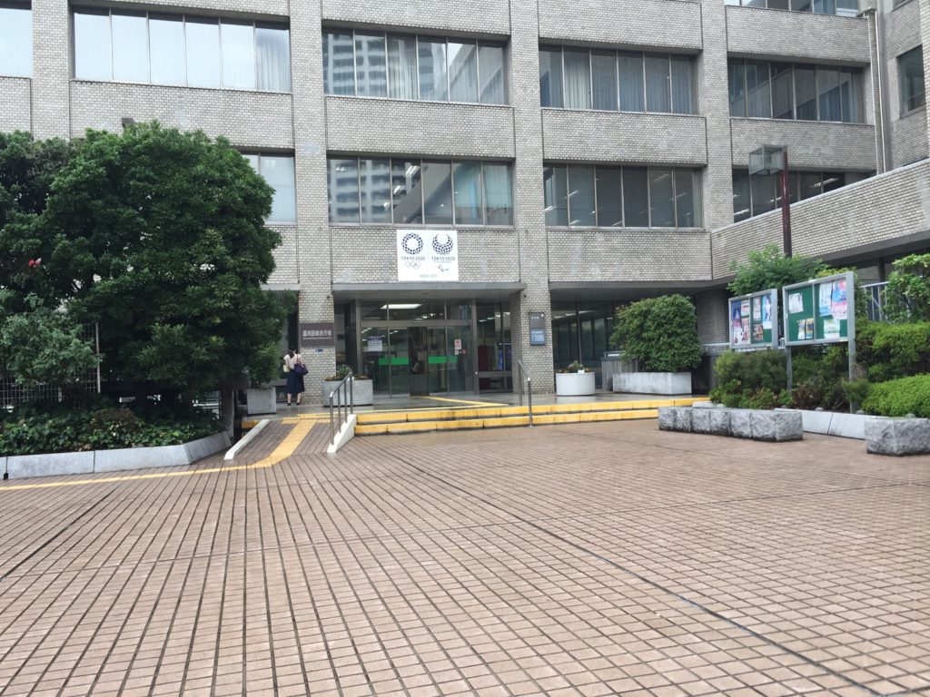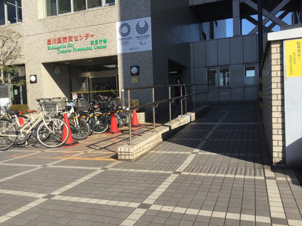 第2庁舎と防災センターの入口(3階部分)スロープもあり車椅子でも入ることができますが、個人的には路面のタイル張りや凸凹の点字ブロックが引っ掛かったりするので気になりました。ここの前には「しながわ中央公園」があります。
