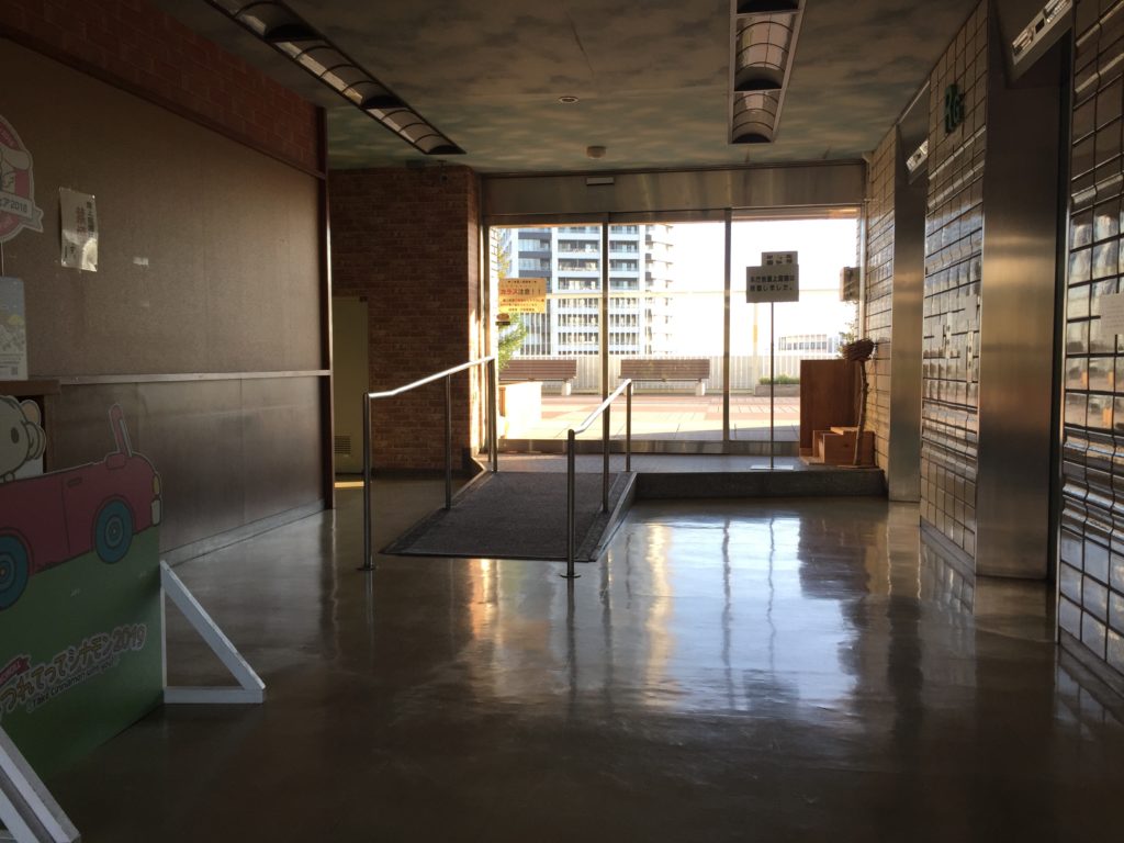 外から来た場合の本庁舎エントランス(3階)ここもタイル張りで歩き難いと感じました。車椅子もタイルの溝に前輪が引っ掛かったり走行し難いと感じました。