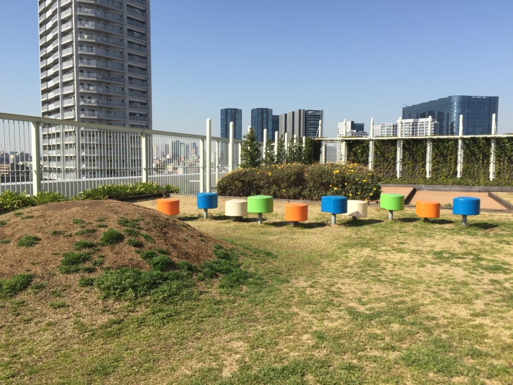 芝生なので子供が転んでも安心だと思いますし、土のお山やカラフルなイスもあり子供が楽しめるスペースですね。