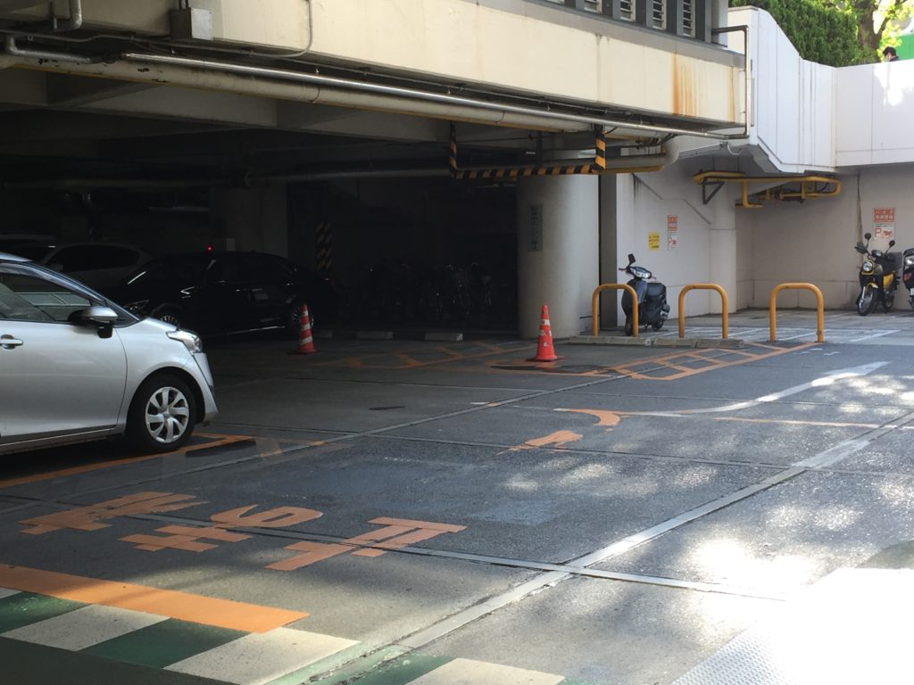 第2庁舎を大崎駅方面にある駐車場から見た外観です。右側のスロープが駐車場の入り口になっています。駐車場内に入ると警備員の人が駐車位置を案内してくれます。