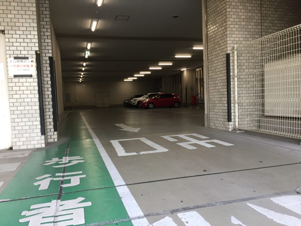緑の歩行者通路に沿ってリボンの前を通過すると奥に駐車場があります。